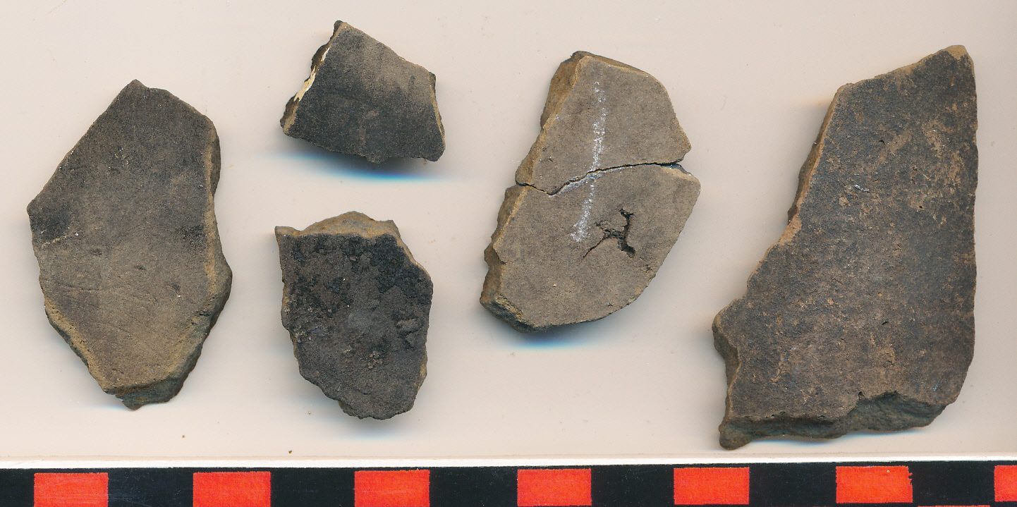 Sötétszürke, fekete törésű, kissé homokos anyagú, korongolt jellegtelen oldaltöredékek.