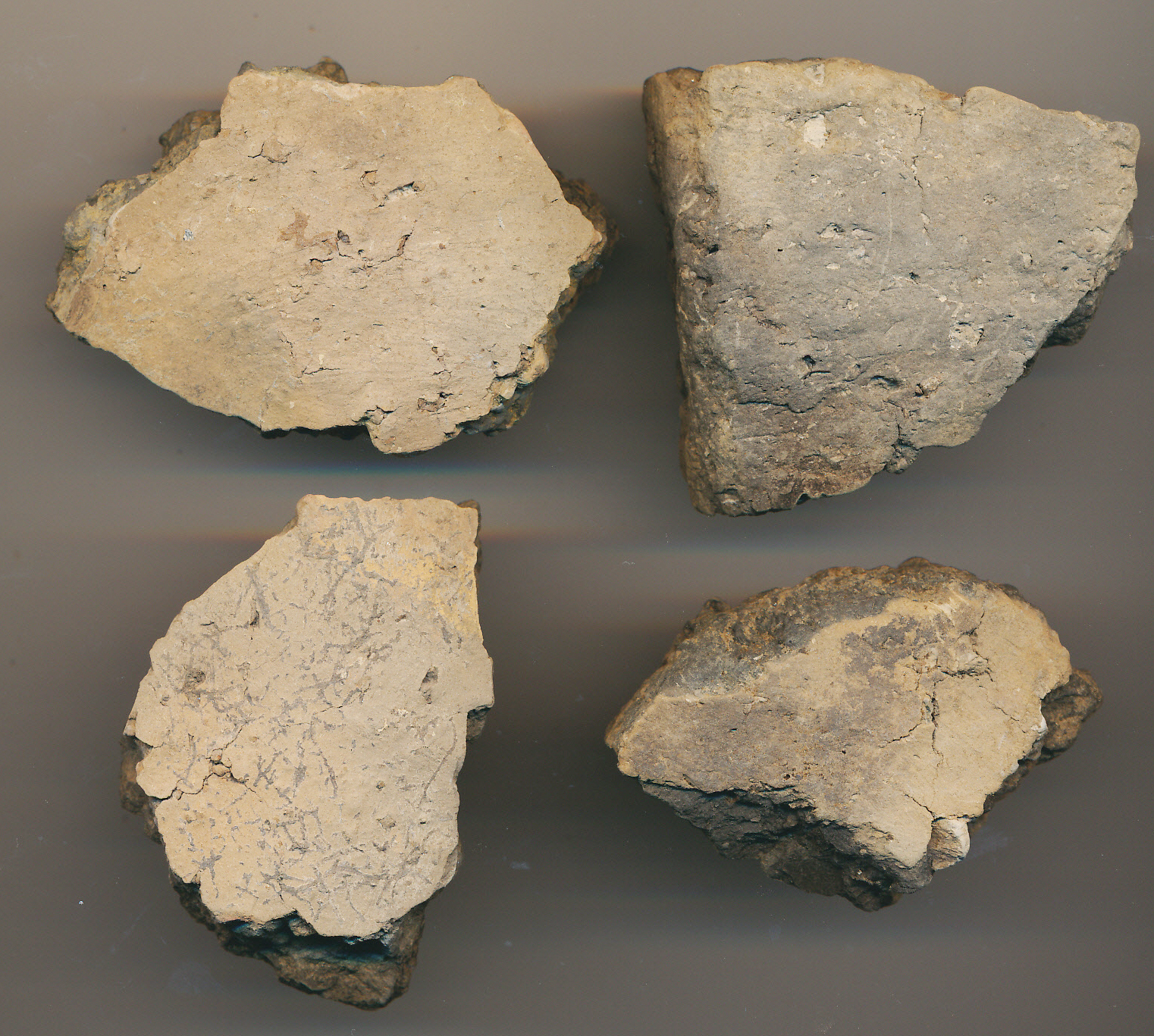 Drapp külső felületű, szürkésfekete törésű, kevés kerámiazúzalékkal soványított, korong nélkül készített, vastagabb falú edények négy jellegtelen oldaltöredéke.