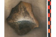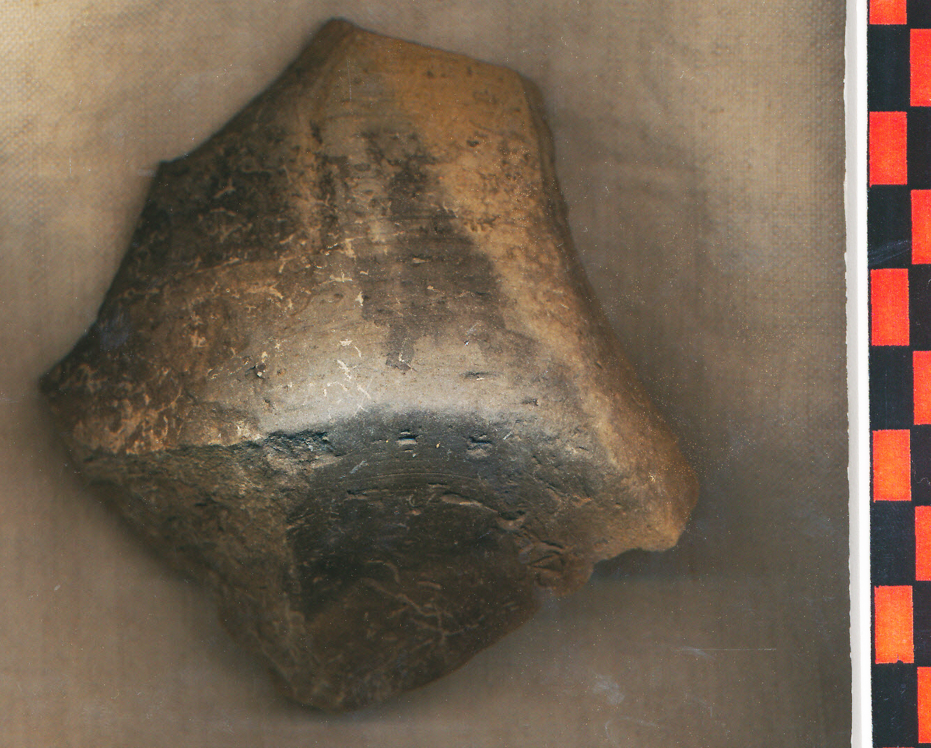 Sárgásszürke, helyenként fekete foltos, korongolt edény vágott, vastag falú aljtöredéke az elvékonyodó felmenő fal indításával. Elsimított külső felületén korongolási karcok látszanak.