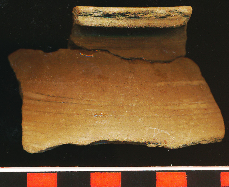 Drapp, kissé homokos anyagú, korongolt edény íves válltöredéke sekélyen és sűrűn benyomott körbefutó vonalakkal díszítve. AZ előző edény töredéke. Összeragasztottuk vele (a fotón már összeragasztva).