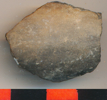 Fényezett fekete-sárga foltos felületű, fekete törésű orsógomb (?) töredéke.