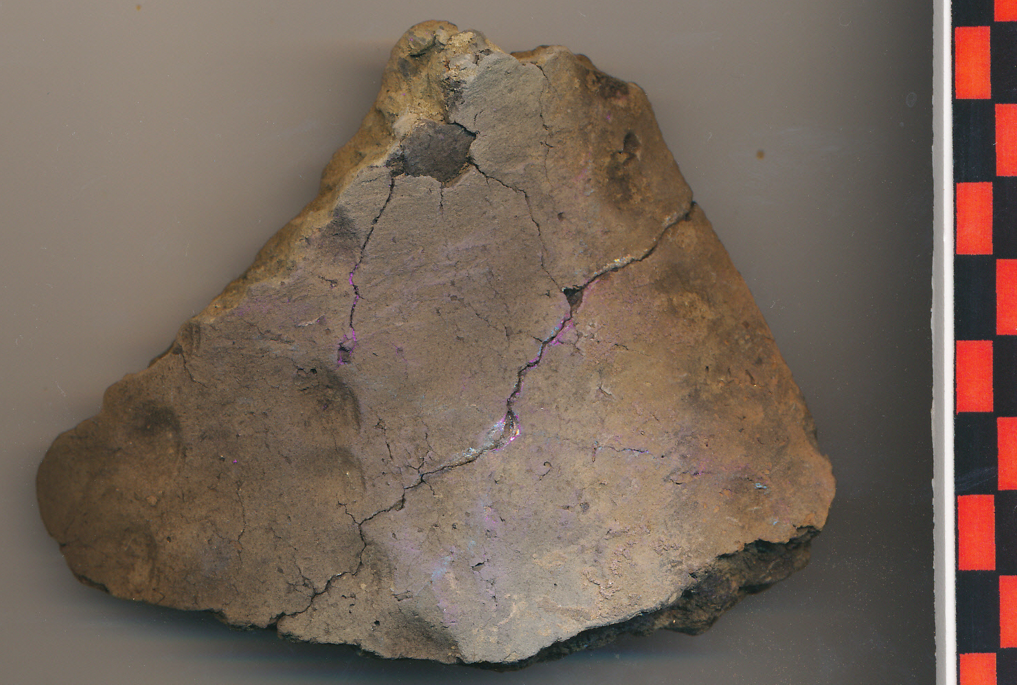 Kívül-belül szürkésfekete, fekete törésű, téglaszínű kerámiazúzalékkal soványított anyagú, eldolgozott felületű, korong nélkül készített edény enyhén íves nyak-váll töredéke 2-2 függőleges sorban elhelyezett sekély benyomkodásokból kialakított dísz közt díszítetlen sávval.