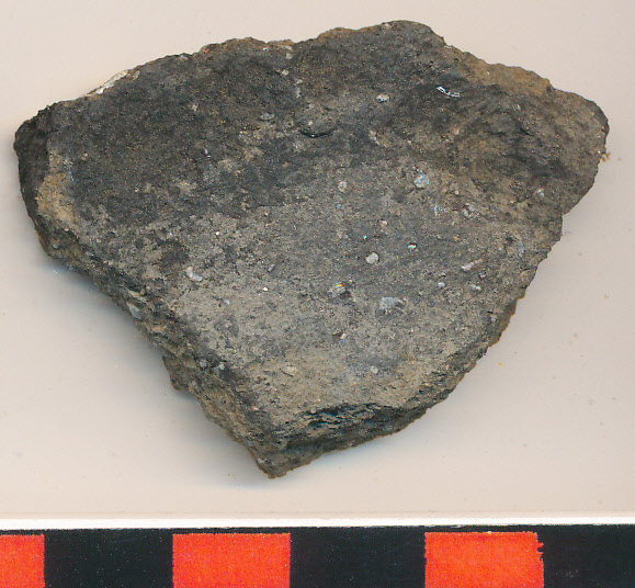 Sötétszürke, kívül fekete foltos, homokos-kavicsos anyagú, korongolt kopott oldaltöredék.