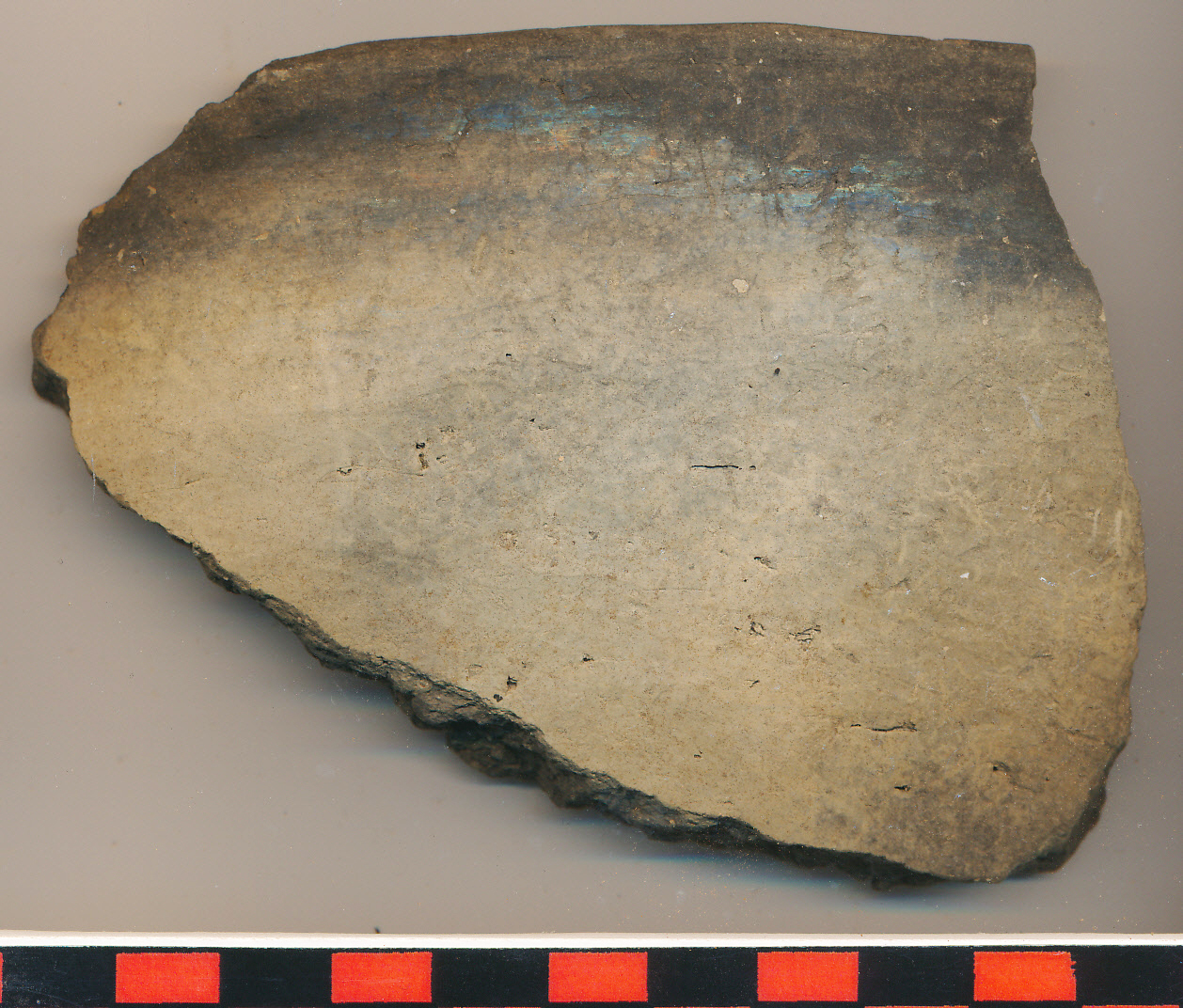 Peremén fekete foltos, sárga, fényezett külső felületű, fekete törésű és belső felületű, belsejében is fényezett, erősen samottos anyagú nagy, lapos tál vízszintesen vágott peremű töredéke.