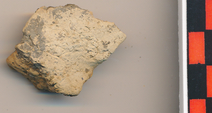 Sárga, kevés kerámiazúzalékkal soványított anyagú, eldolgozott felületű, korong nélkül készített edény kis kopott oldaltöredéke.