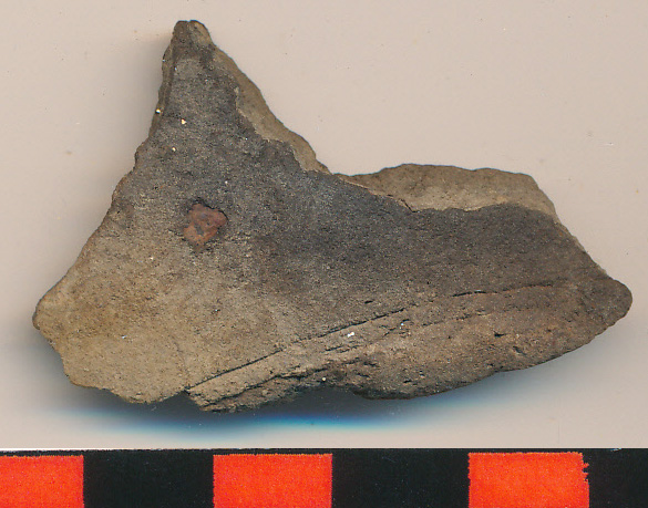Fekete-barna foltos külső felületű, fekete törésű, kissé homokos anyagú, korongolt edény oldaltöredéke az alj indulása közelében.