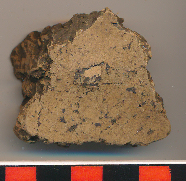 Világosbarna, kerámiazúzalékkal soványított, korong nélkül készített edény kopott oldaltöredéke.