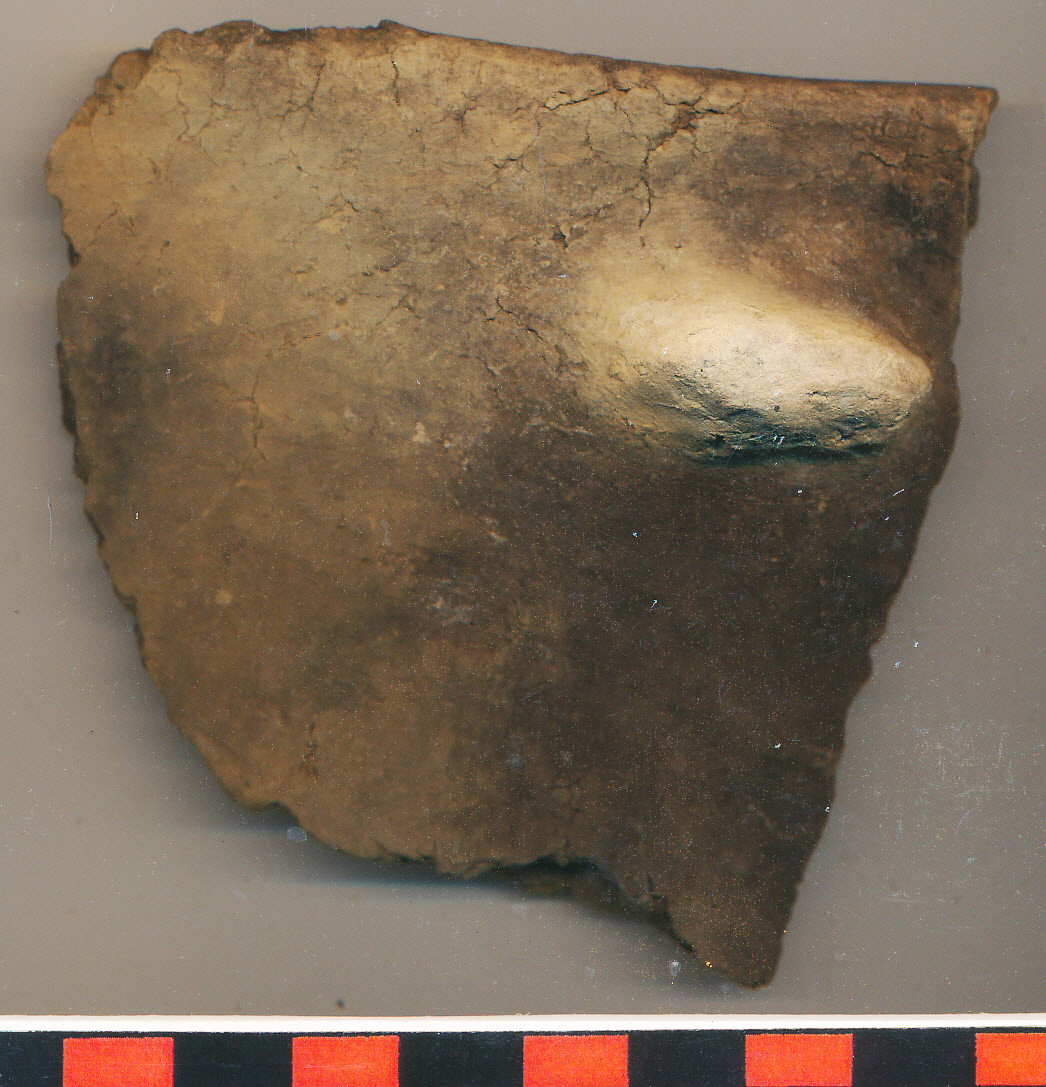 Sárga-szürke-fekete foltos, kívül-belül fényezett, szürkésfekete törésű, erősen kerámiazúzalékos anyagú nagyobb edény magas, csonkakúpos nyakú, egészen enyhén kihajló, kissé elvékonyodó peremű töredéke a nyak közepén vízszintes ovális bütyökkel.