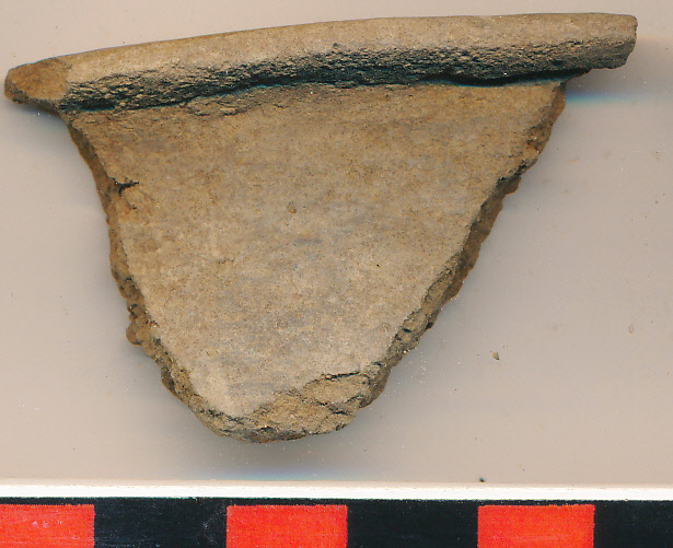 Világosbarna, kívül-belül elsimított felületű, kerámiazúzalékkal soványított, vékonyabb falú edény kihajló, elvékonyodó peremtöredéke.