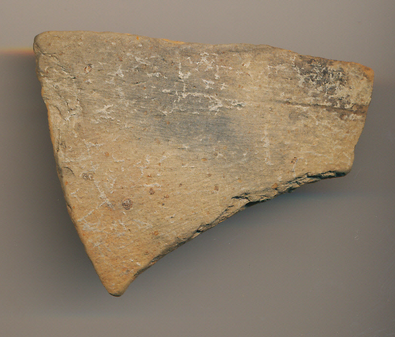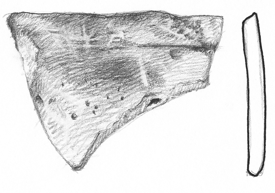 Piszkos téglaszínű, fekete foltos, korongolt, vékony falú edény íves oldaltöredéke külsején korongolási nyomokkal.