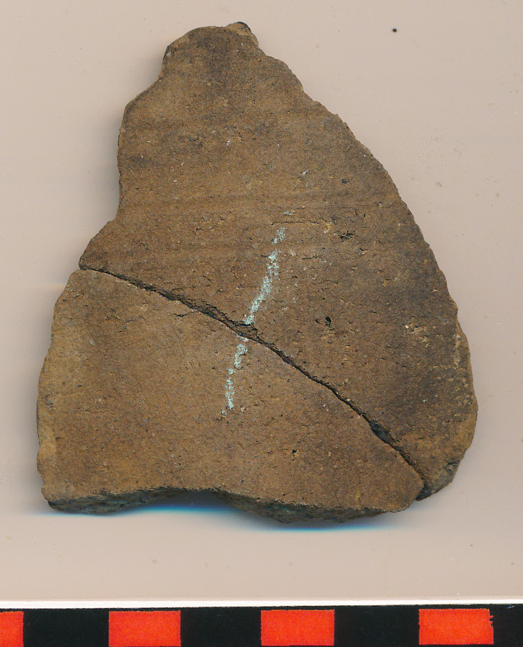 Sötétbarna külső felületű, fekete törésű, kissé homokos anyagú, korongolt edény íves oldaltöredéke sekélyen benyomott vízszintes vonalas díszítéssel. 2 db-ból ragasztott. Talán a 2016.119.8 töredékkel összetartozik.