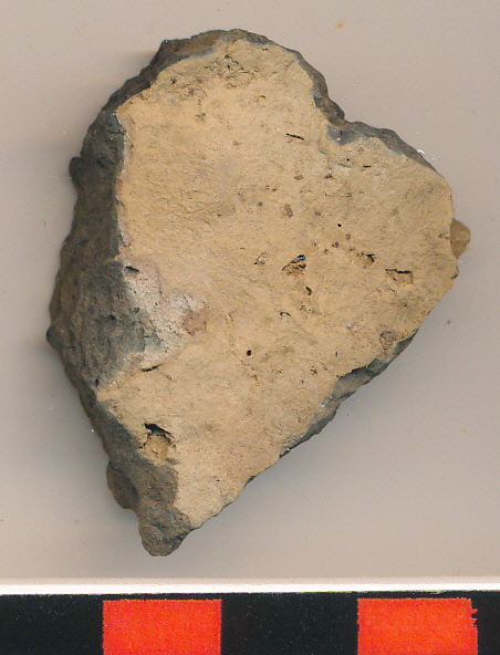 Drapp külső felületű, fekete törésű, kevés kerámiazúzalékkal soványított, korong nélkül készített, eldolgozott felületű oldaltöredék.