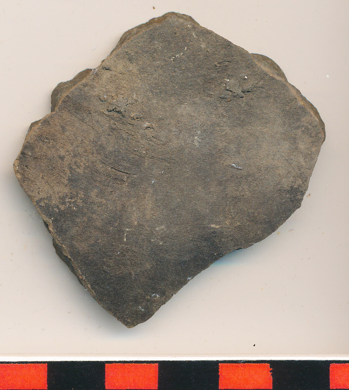 A betöltés felső rétegében: Fekete külső felületű, belül világosszürke, sötétszürke törésű, egészen kicsit homokos anyagú, korongolt nagyobb edény oldaltöredéke.