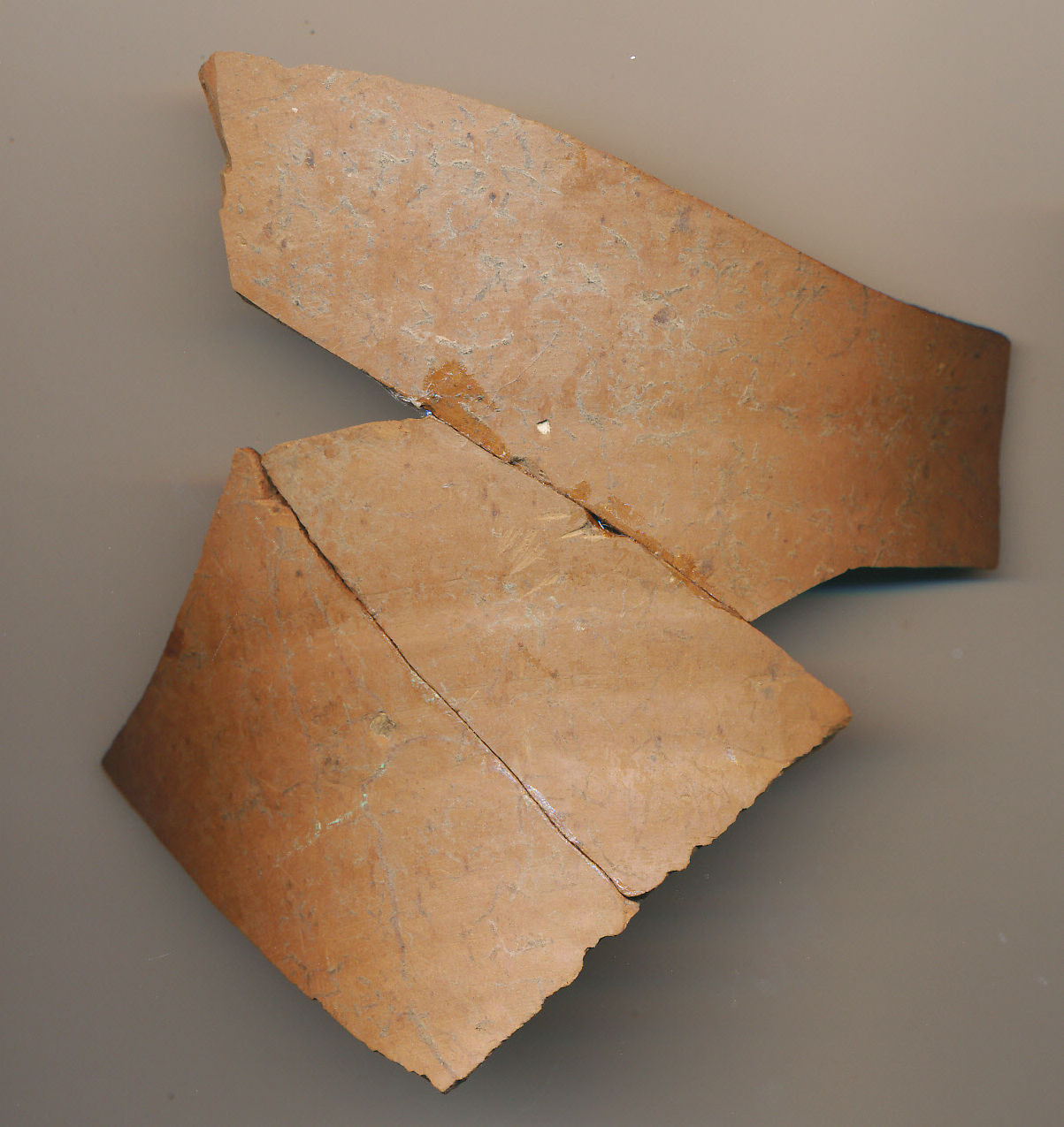 Téglaszínű, korongolt, külső felületén simított, vékony falú, keményre égett oldaltöredék a belsejében a korongolás "hurkáival".