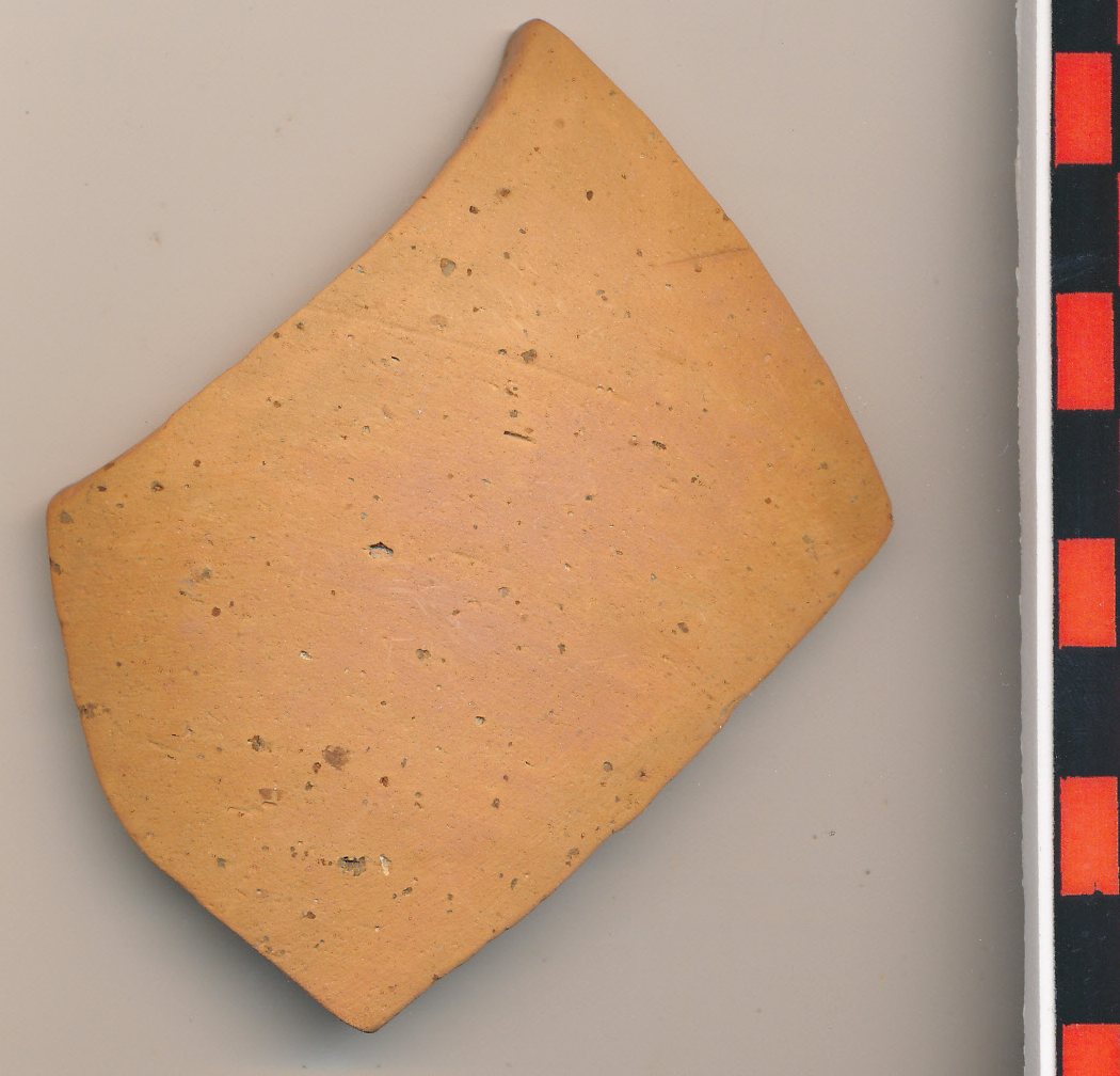 Kívül-belül téglaszínű, szürke szendvicses törésű, korongolt, vékony falú edény íves oldaltöredéke az alsó harmadból.