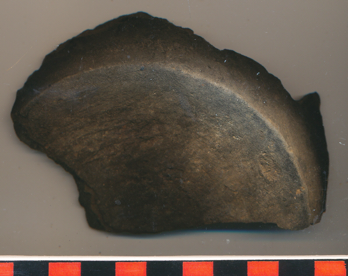 Sötétszürke, kívül fekete foltos, kevés homokkal soványított anyagú, korongolt edény vágott, enyhén benyomott aljtöredéke.