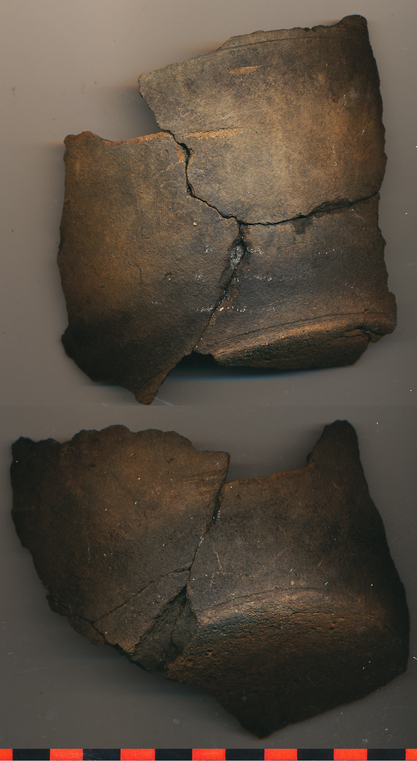 A betöltés felső rétegében: Téglaszínű, fekete foltos külső-belső felületű, fekete törésű, korongolt, homokos anyagú nagyobb edény vágott alja felmenő fal indításával. 3-3 db-ból ragasztott.