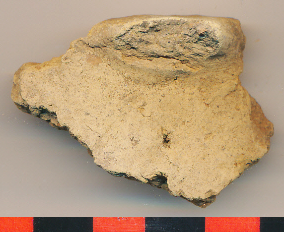 Sárga, függőleges nyakú, vízszintesen kihajló peremű töredéke a peremhez illeszkedő vízszintes, ovális, letört bütyök helyével.