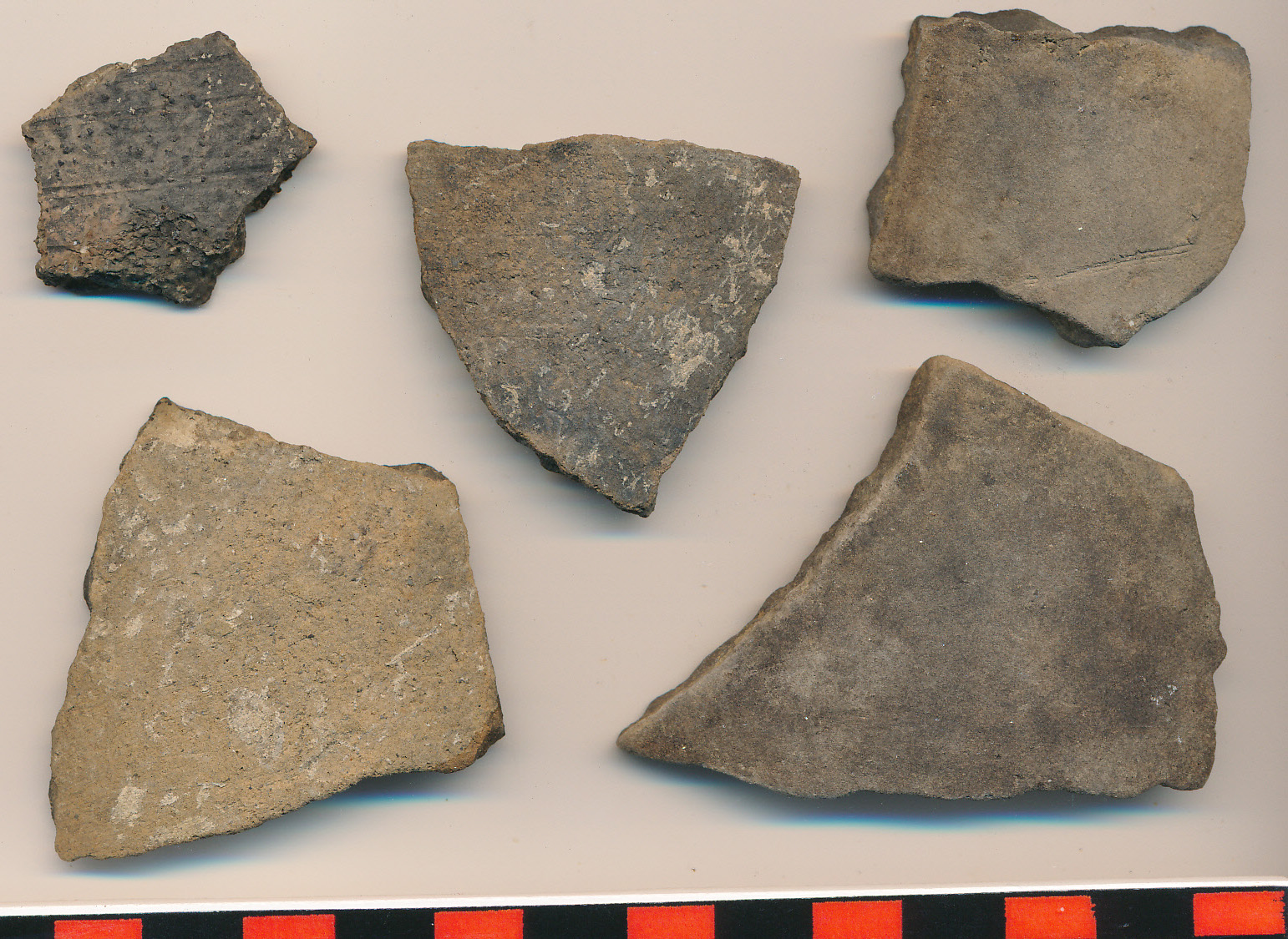 Szürke, illetve szürkésfekete, valamint 1 drapp külső felületű, fekete törésű, homokos anyagú, korongolt edények 1-1 jellegtelen oldaltöredéke, illetve egy kis darab apró kavicsos, érdes rajta 2 vékony karcolt vonallal.