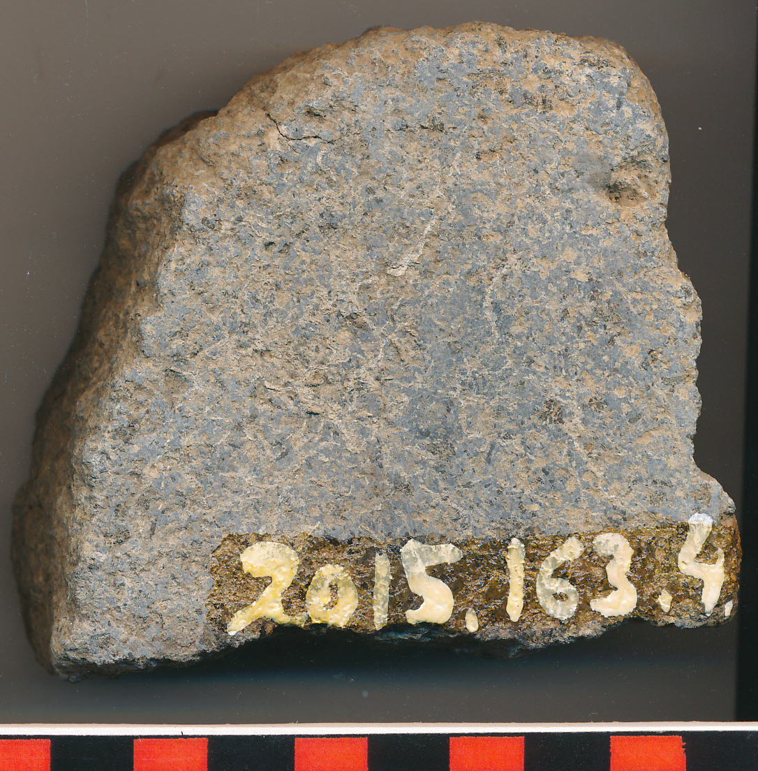 Lekerekített egyik sarkú háromszög alakú, sötétszürke, szemcsés, lapos, egyik oldalán lecsiszolódott malomkő töredék.