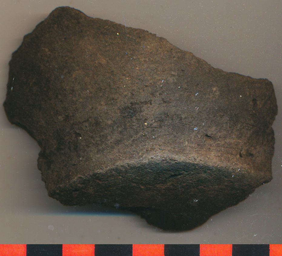 A betöltés felső rétegében: Fekete, homokos anyagú, korongolt, vastagabb falú edény vágott aljtöredéke a felmenő fal indításával.