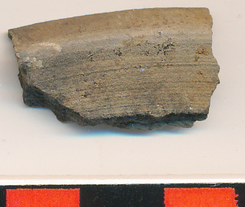 Szürkésbarna külső felületű, fekete törésű, kissé homokos anyagú, vékony falú, korongolt fazék kihajló, ferdén levágott és tagolt kis pereme.
