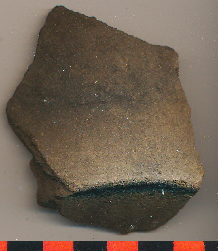 A betöltés felső rétegében: Szürke, kívül fekete foltos, homokos anyagú, korongolt edény vágott alja a felmenő fal indításával.