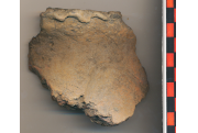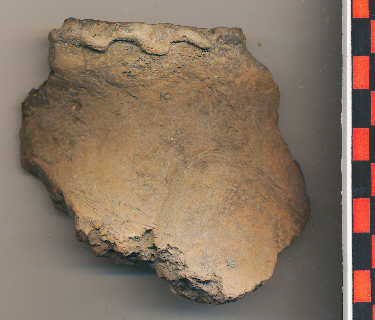 Kívül téglaszínű felületű, fekete törésű, belsejében szürkésfekete, téglaszínű foltos, kerámiazúzalékkal soványított anyagú, korong nélkül készített edény enyhén kihajló peremtöredéke mélyebb benyomkodásokkal tagolva, íves nyak alatt enyhén domborodó vállán vízszintesen behúzott hullámvonaldísz részlete látszik.