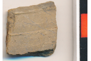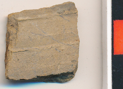 Világosbarna, korongolt, vékony falú, homokos anyagú edény oldaltöredéke 2 sekély körbefutó karcolással.
