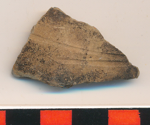 Téglaszínű, kissé kormos külső felületű, szürke törésű, homokos anyagú, vékony falú, korongolt edény íves kis töredéke 2 szabálytalanul benyomott vonaldísszel.