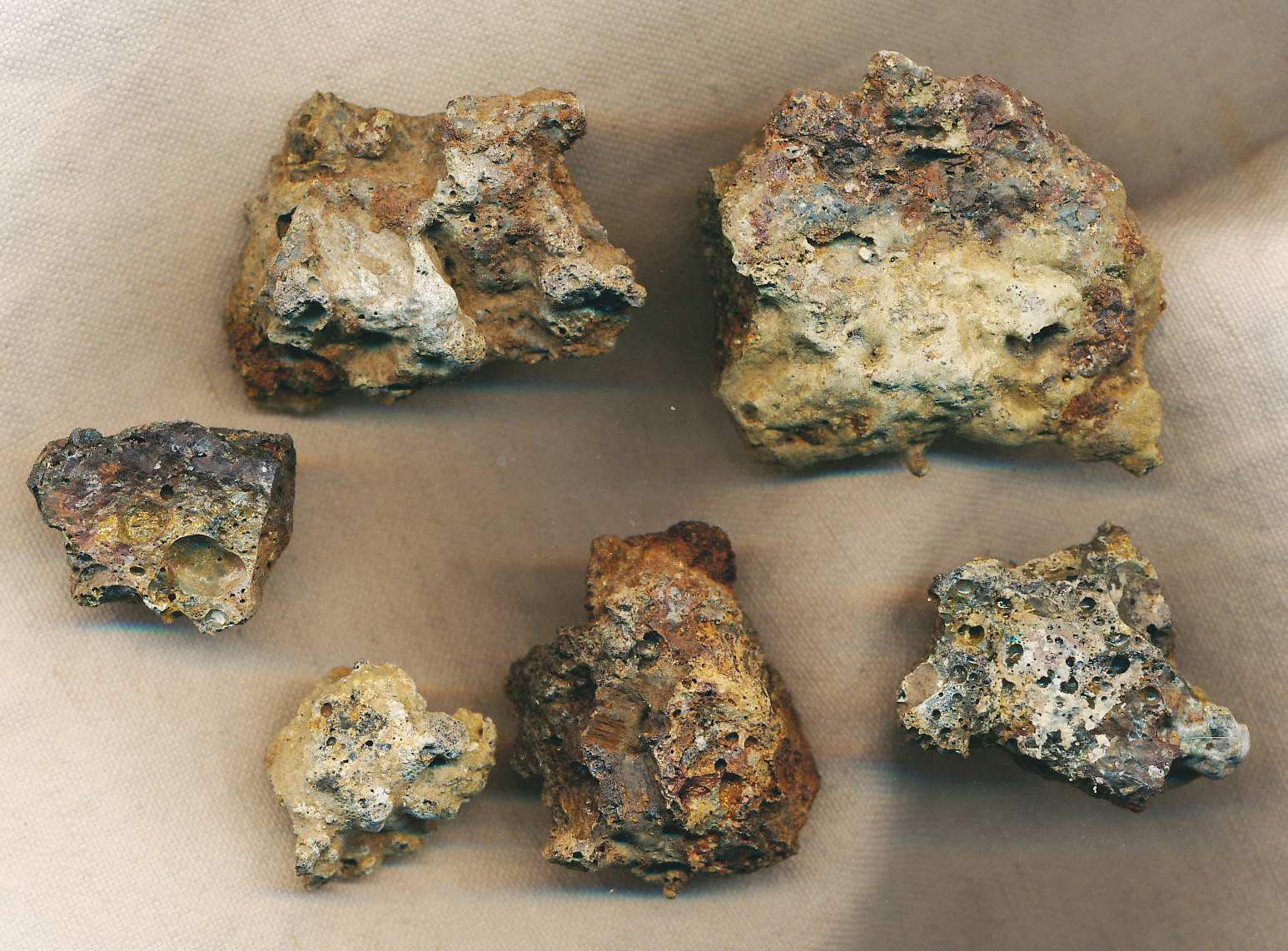 Barna-szürke foltos, szabálytalan alakú, üveges-szivacsosra égett salakdarabok. A 4 leltározott mellett 2 db-ot anyagvizsgálatra tettünk el.