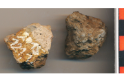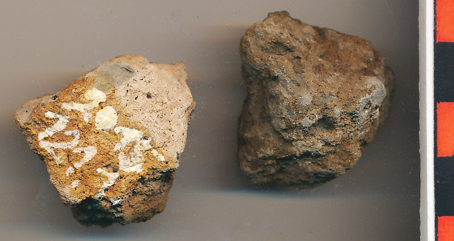 Szabálytalan alakú, morzsolódó, szürkére, illetve téglaszínűre égett, homokos anyagú paticsdarabok.