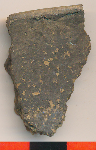Fekete, elsimított külső felületű, drapp törésű, belső felületén ugyancsak elsimított, kisebb edény egészen picit kihajló, elvékonyodó pereme.