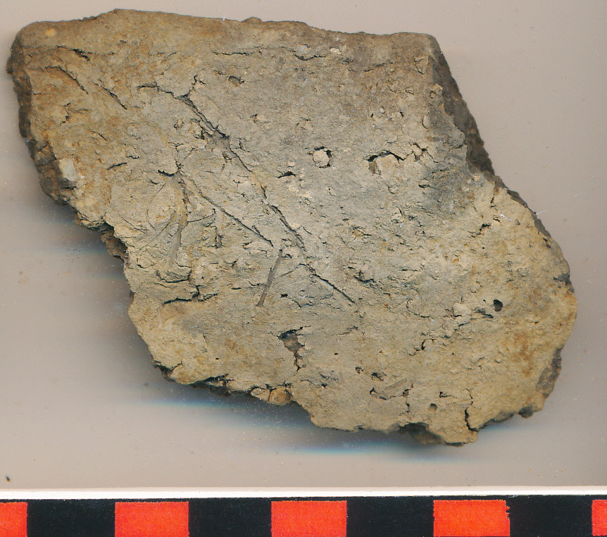 Világosszürke külső-belső felületű, fekete törésű, durva felületű (belül talán még durvított felületű is), feélgömbös tál elvékonyodó peremű töredéke, belül a peremen két helyen mély beszúrt lyukkal.