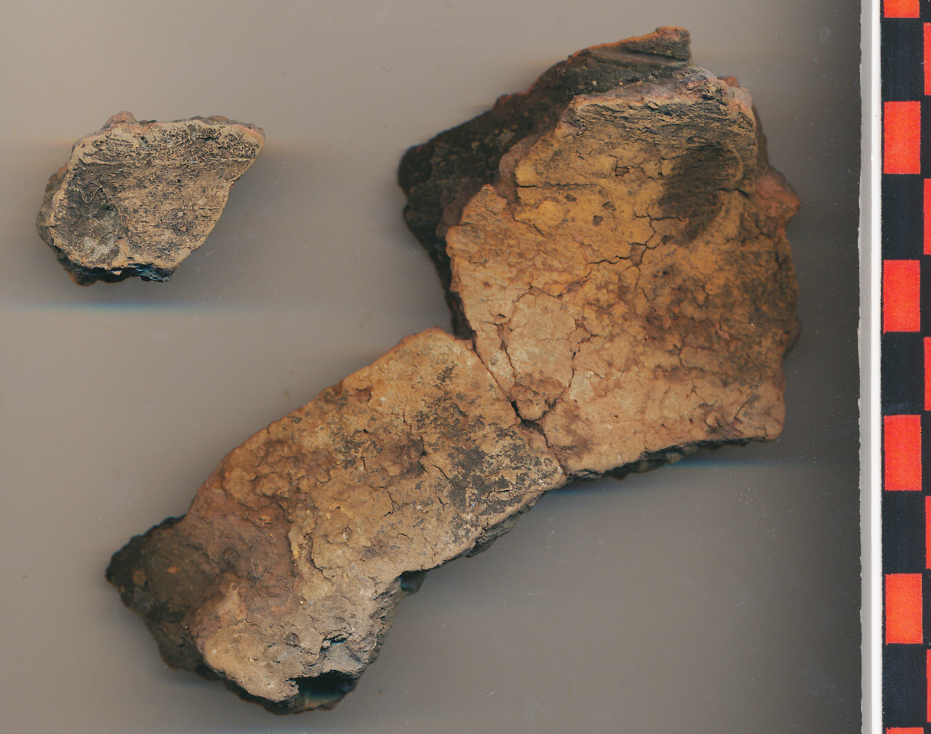 Kívül-belül téglaszínű felületű, fekete törésű, kerámiazúzalékkal soványított anyagú, korong nélkül készített edény 2, kívül kormos oldaltöredéke az íves nyak indításával, melyen benyomott ovális díszítések látszanak. Az egyik két darabból ragasztott.