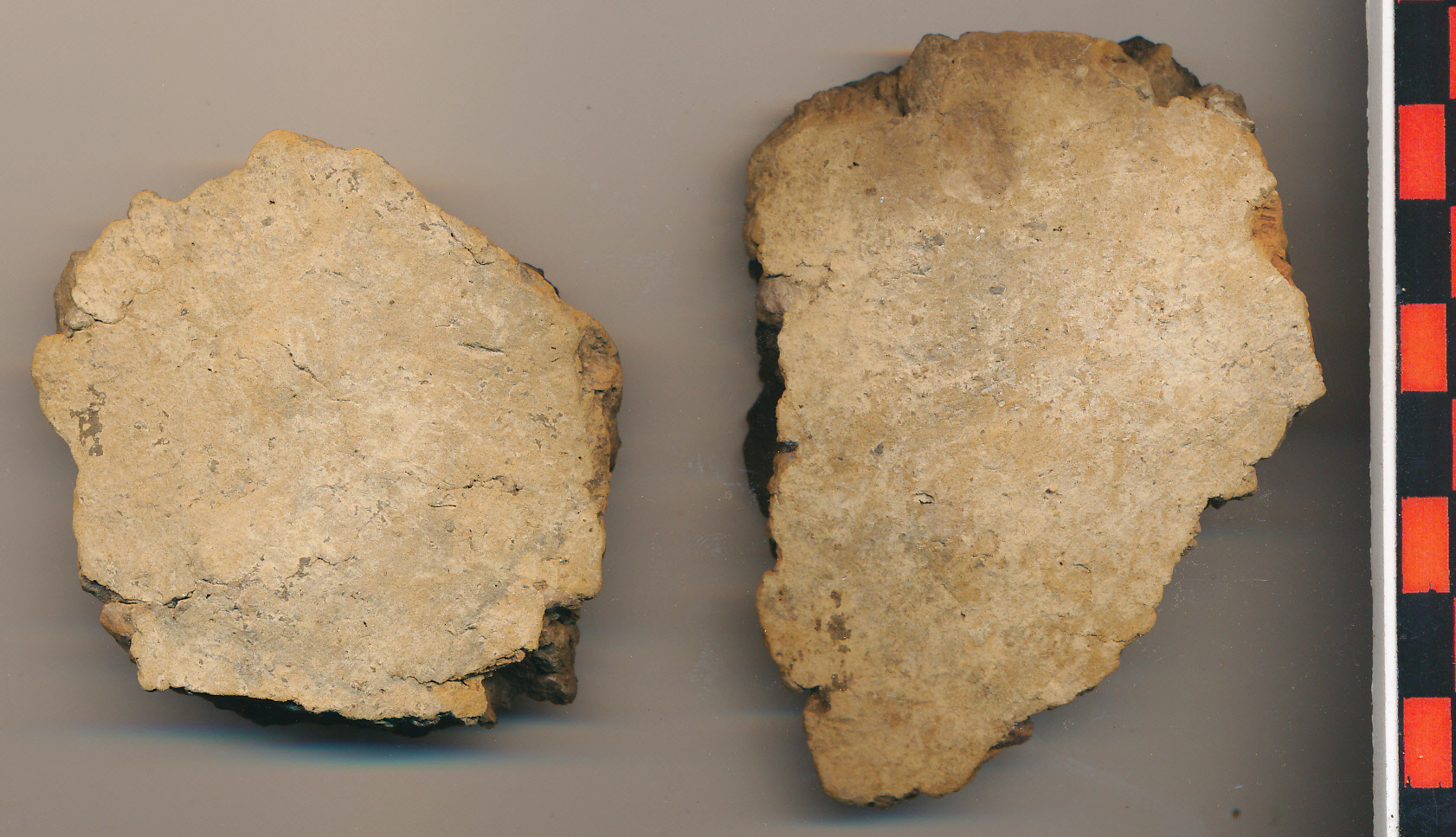 Sárgás téglaszínű külső felületű, fekete törésű, kerámiazúzalékkal soványított anyagú, korong nélkül készített edény durvább kivitelű két íves, vastagabb falú oldaltöredéke. Az egyiken ujjal benyomott oválisokból kialakított díszítő sor kezdete.
