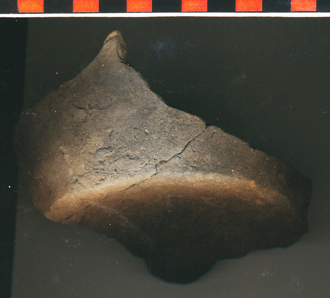 Fekete, homokos anyagú, korongolt nagyobb edény enyhén benyomott vágott alja a felmenő fallal. 2 db-ból ragasztott.