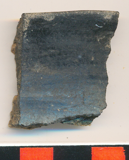 Fekete, fényezett külső felületű, drapp törésű, belső felületén elsimított, kisebb edény egészen picit kihajló, elvékonyodó pereme.