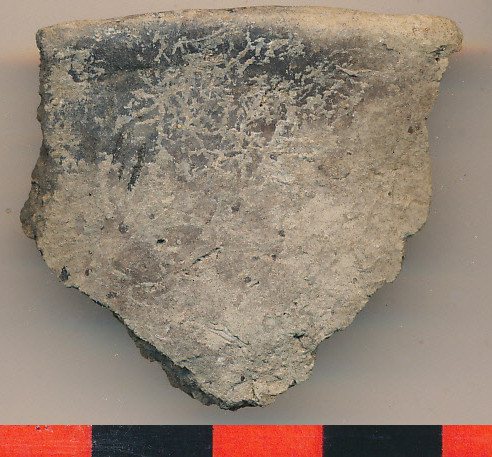 Fekete foltos sárgásszürke külső felületű, fekete, közepesen durva kivitelű kis, vékony falú, félgömbös tál belülről elvékonyodó peremű töredéke.