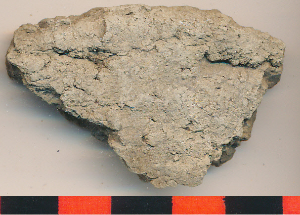 Világosszürke, durva kivitelű, apró kerámiazúzalékkal soványított, fekete törésű, egészen meredeken kifelé tartó, elvékonyodó peremtöredék.
