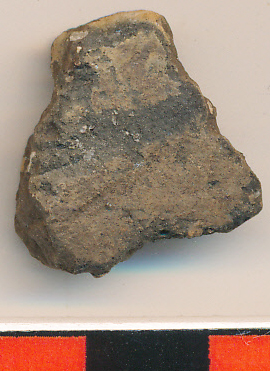 Kívül barna, belül téglaszínű felületű, fekete törésű, kissé homokos anyagú, korongolt edény apró, kopott oldaltöredéke.