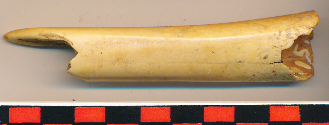 A betöltés alsó rétegében: ovális metszetű csontcső, az egyik végén hegyesre faragva.
