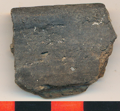 Fekete, kerámiazúzalékkal soványított, kívül-belül eldolgozott felületű kisebb tál belsejében duzzadt peremű tál töredéke.