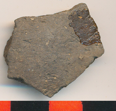 Sötétszürke külső felületű, fekete törésű, enyhén homokos anyagú, korongolt edény kisebb oldaltöredéke.
