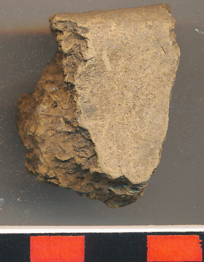 Eldolgozott felületű, sárga, igen vastag falú edény belül ívesen kissé kifelé elvékonyodó pereme.