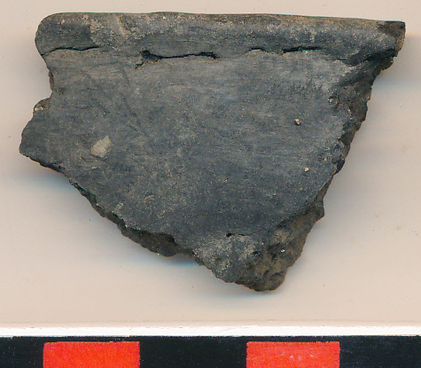 Fekete, kívül-belül elsimított felületű, nagyon kevés kerámiazúzalékkal soványított, kisebb, félgömbös tálka enyhén kihúzott peremű töredéke.