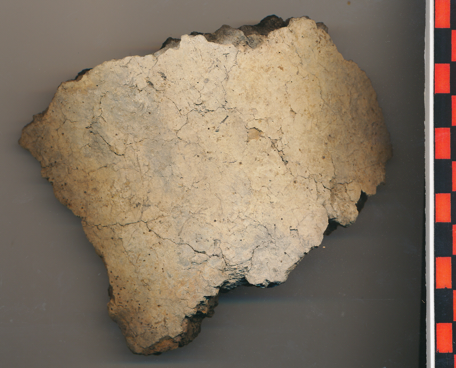 Sárga külső felületű, szendvicses szüre-fekete törésű, belsejében kormos, kerámiazúzalékkal soványított anyagú, korong nélkül készített nagyobb edény íves nagyobb oldaltöredéke.