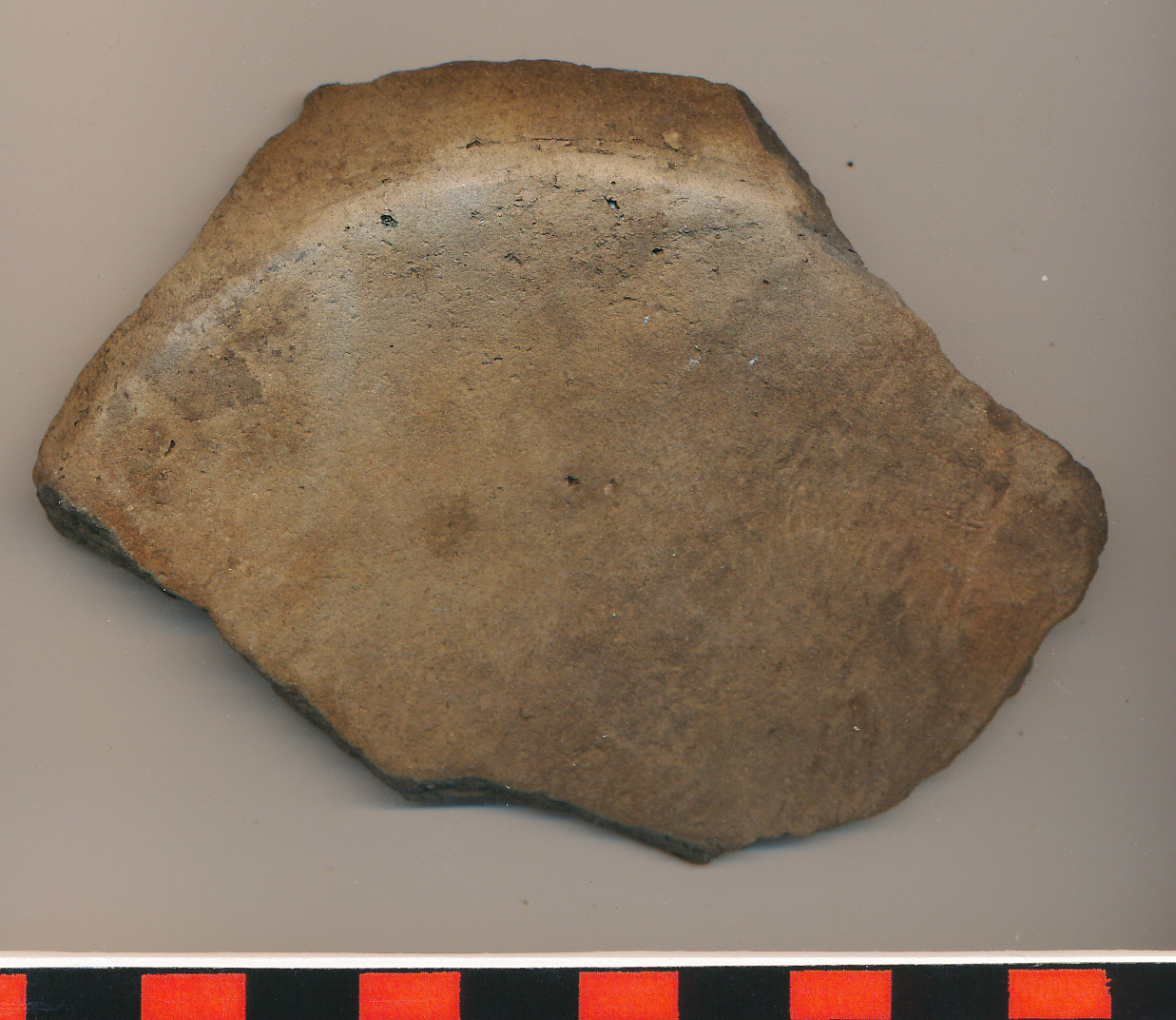 Világosszürke külső felületű, fekete törésű, homokos anyagú, korongolt edény vágott alja a felmenő fal kicsi csonkjával.
