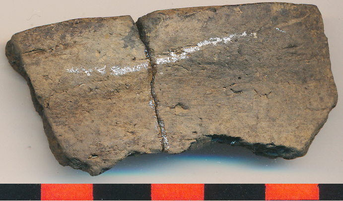 Fekete, kívül-belül eldolgozott felületű, kopott, enyhén kihajló, elvékonyodó peremtöredék 2 db-ból ragasztva.