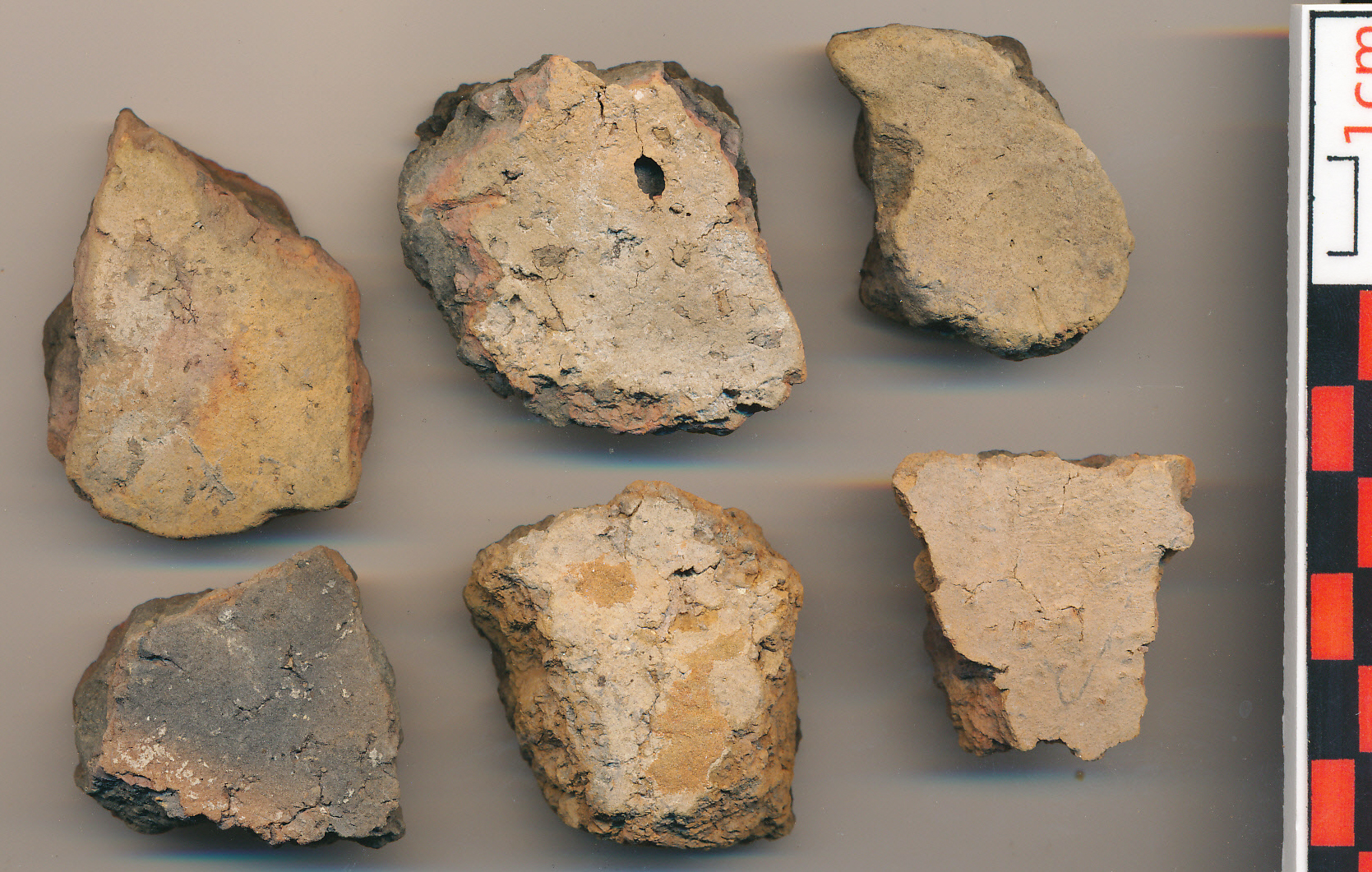 Téglaszínű külső felületű, zömében szürke törésű, kerámiazúzalékkal soványított anyagú, korong nélkül készített edények 6 db kisebb jellegtelen oldaltöredéke.